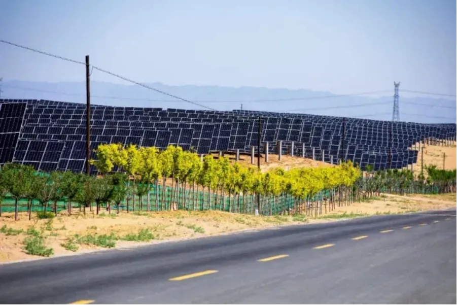 ▲?庫布其基地項目場區道路兩邊種植了防護林。?攝影:張博文