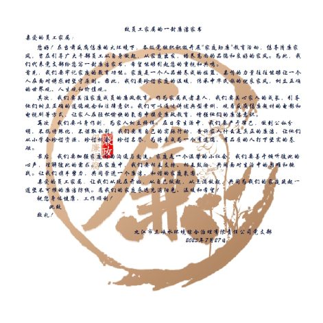 江西區(qū)域公司黨總支積極推進廉潔文化陣地建設,在辦公場所內(nèi)張貼廉潔文化宣傳海報,組織員工開展廉潔文化作品創(chuàng)作,開展家庭助廉活動,通過向職工家屬發(fā)送廉潔家書、職工家屬向員工發(fā)送廉潔寄語等形式,積極打造廉潔從業(yè)“自律線”,不斷厚植企業(yè)廉潔文化土壤。